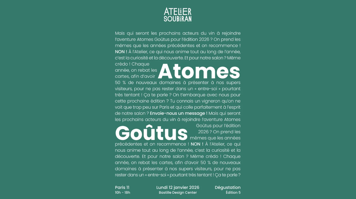 Atomes Goûtus, c’est le salon qui défend les vignerons et les idées. Il met en lumière des domaines à forte identité, unis par l’exigence, l’ouverture et la sincérité. Curiosité, découverte et échanges humains en sont la signature : avec plus de 70 % de nouveaux domaines issus de 18 régions viticoles, ainsi que de Belgique et de Suisse, cette édition propose un casting renouvelé, engagé et passionné. Un rendez-vous immanquable pour les amateurs de vin et de découvertes !